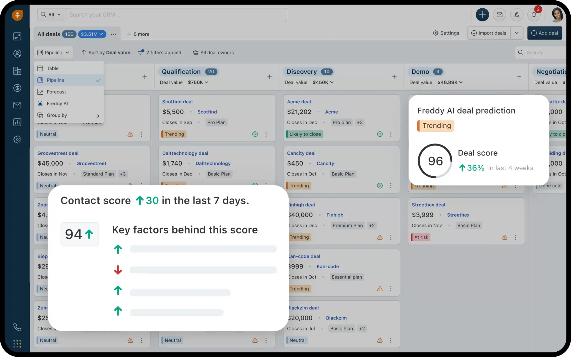 Freshworks CRM (sebelumnya Freshsales) dikenal dengan antarmukanya yang modern, kemudahan penggunaan, dan fitur-fitur berbasis AI. Untuk manufaktur, Freddy AI dapat membantu dalam scoring prospek, mengidentifikasi kesepakatan yang berisiko, dan memberikan wawasan prediktif. Ini adalah alat yang hebat untuk tim penjualan yang ingin bekerja lebih cerdas, bukan hanya lebih keras.