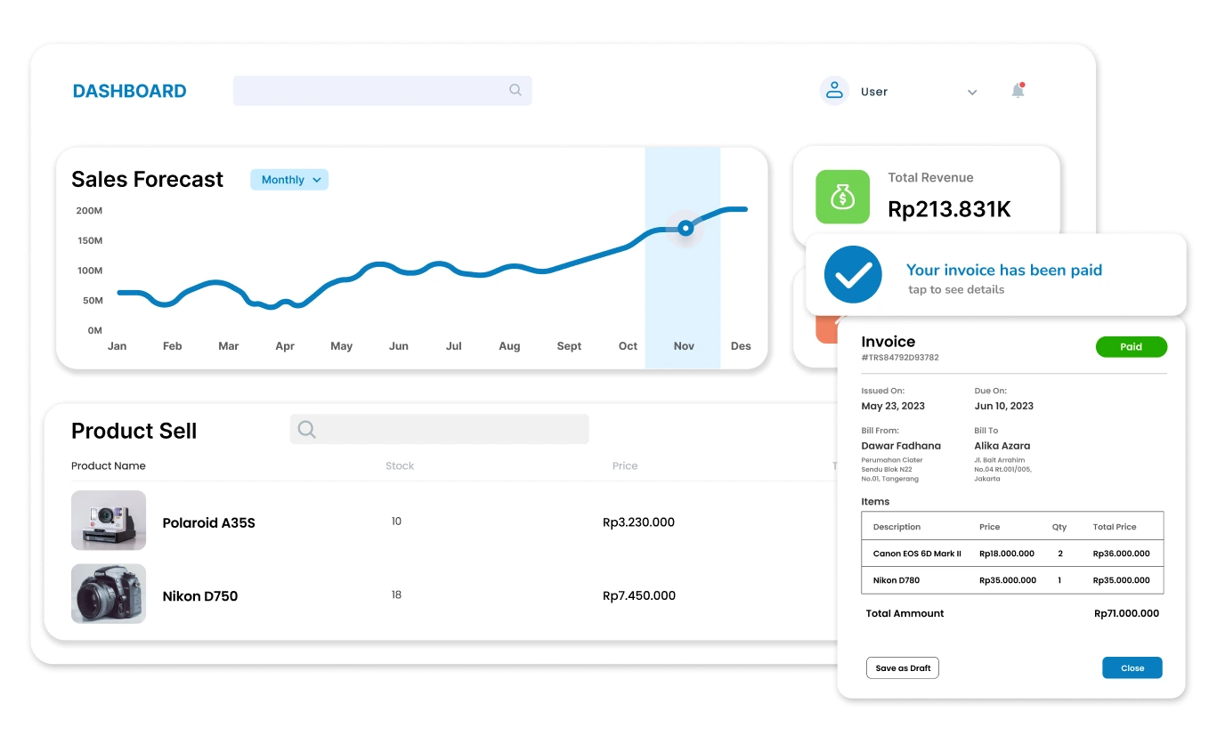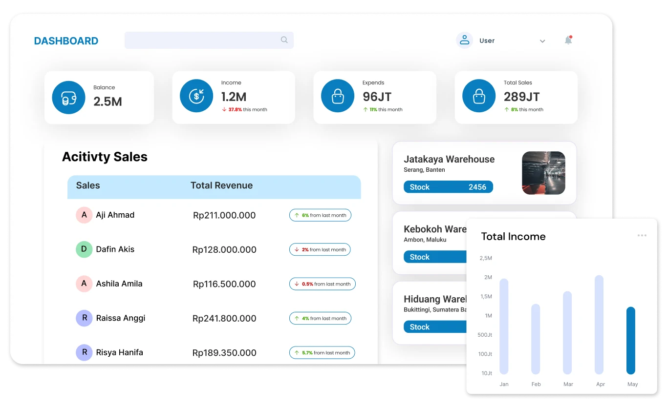 Pantau perkembangan bisnis secara menyeluruh dan praktis dengan real-time data update dalam satu dasbor.