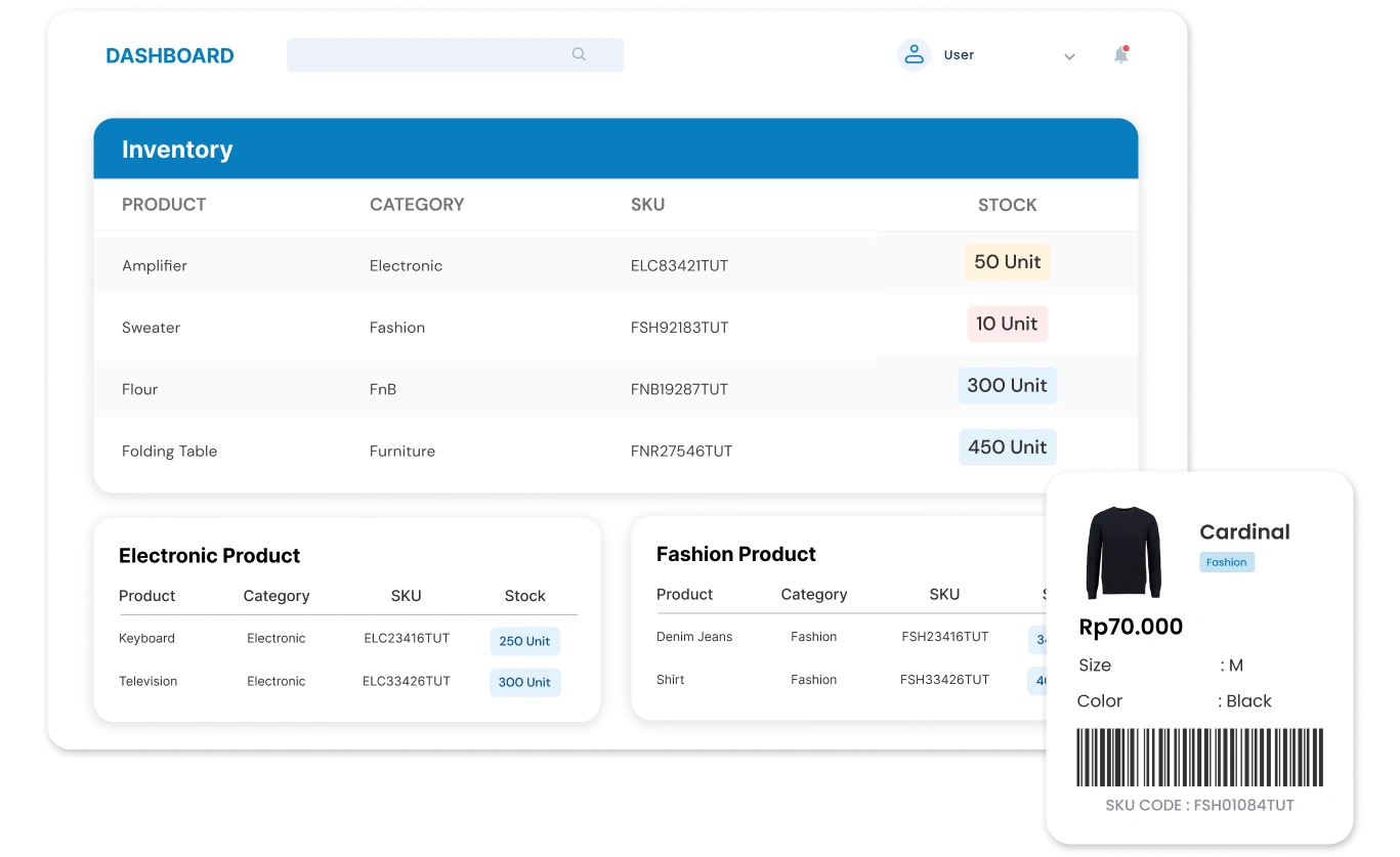 Monitor pergerakan stok secara real-time dengan sistem barcode & RFID.