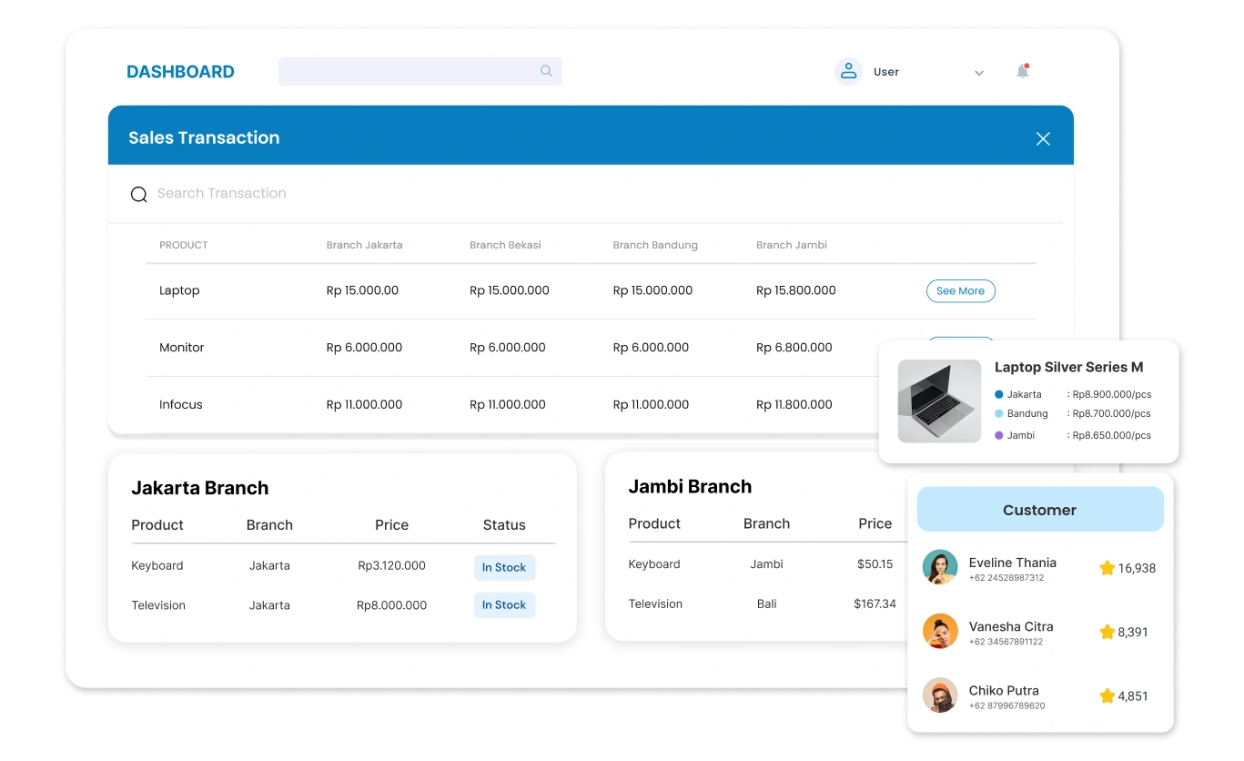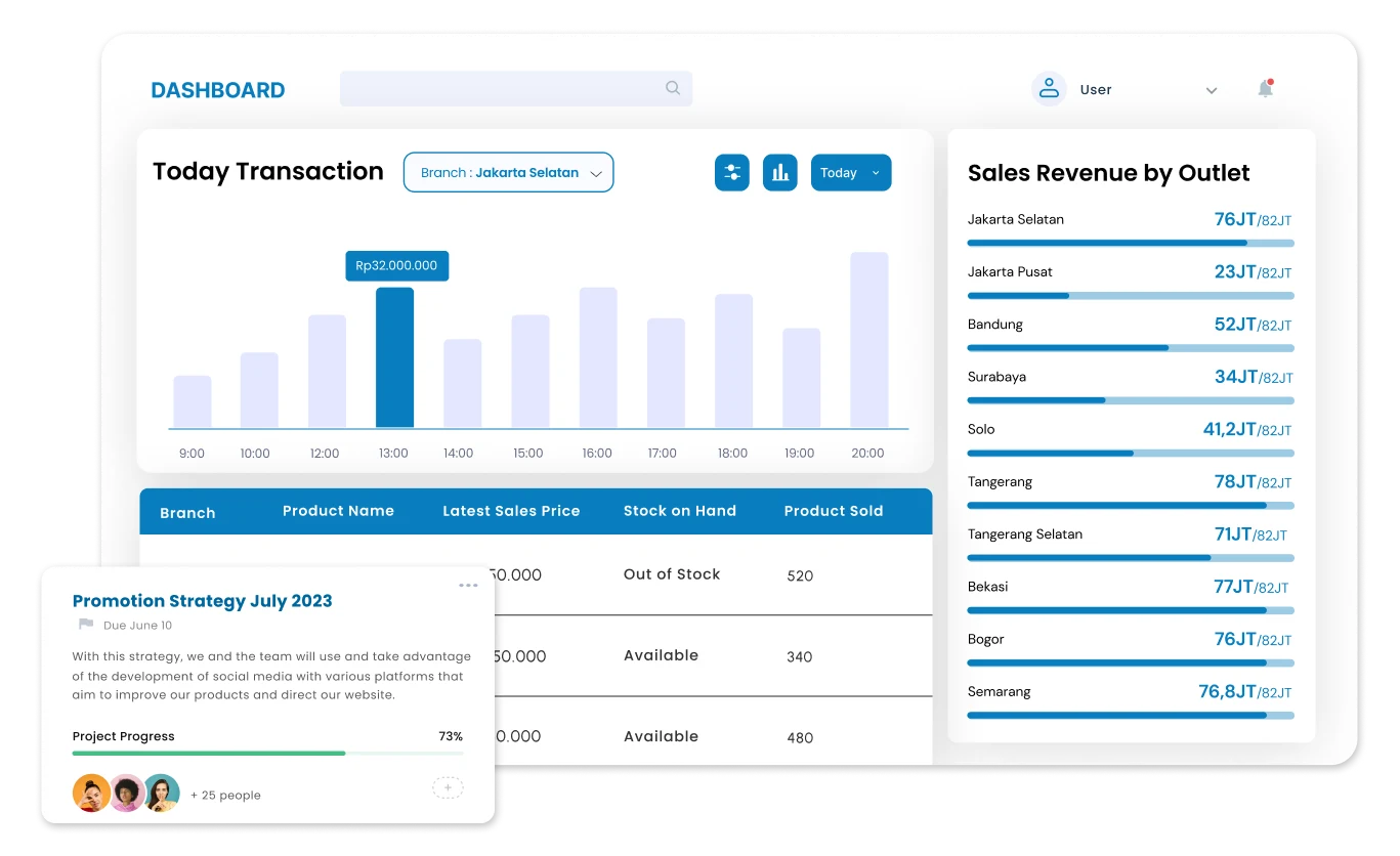 Dapatkan informasi transaksi jual beli, laporan laba-rugi, stock opname, produk terlaris, hingga data customer dari setiap outlet.