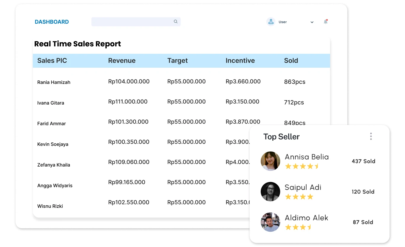 Pantau performa penjualan secara real-time & dapatkan laporan pencapaian target berdasarkan performa individu atau pun tim.